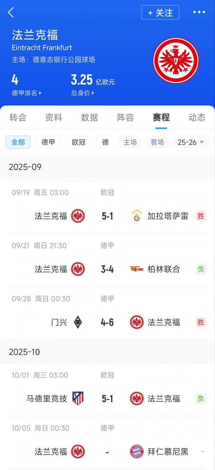 Kỷ lục của Frankfurt trong 4 trận gần đây: 5-1 Galatasaray, 3-4 Berlin United, 6-4 Borussia Dortmund, 1-5 Atletico Madrid, ít nhất 6 bàn thắng trong mỗi trận đấu, bạn sẽ chết hoặc tôi chết. Trong trò chơi tiếp theo, Frankfurt sẽ đối mặt với Bayern ở nhà.