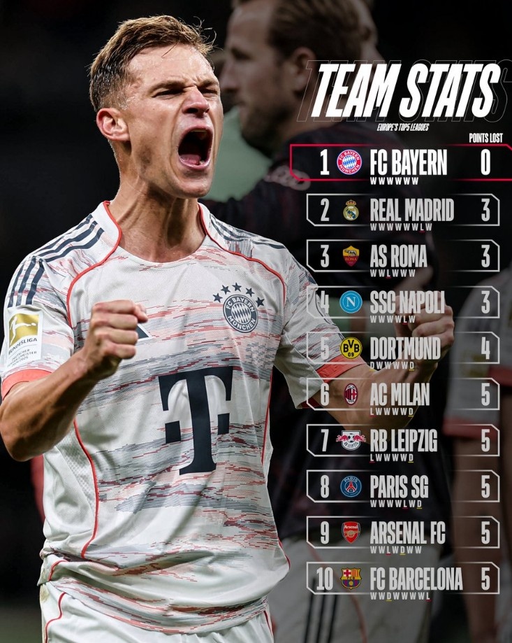 Không đăng lại mà không được phép:GsuNews » Năm giải đấu lớn đã mất ít điểm nhất: Bayern xếp hạng đầu tiên với tất cả các chiến thắng, Real Madrid, Roma và Naples mất 3 điểm