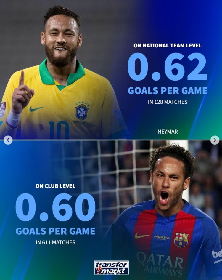 Neymar (33 tuổi): Câu lạc bộ có 611 trận, trung bình 0,60 bàn mỗi trận; Đội tuyển quốc gia có 128 trận đấu, trung bình 0,62 bàn mỗi trận