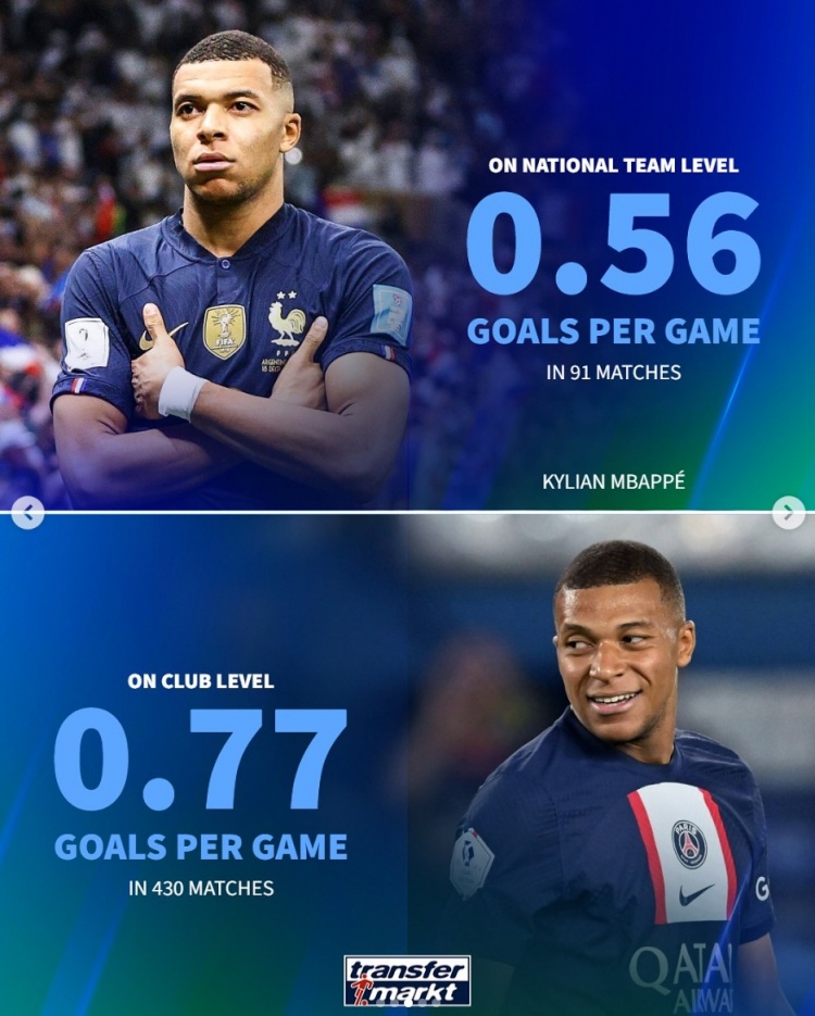 MBappe (26 tuổi): Câu lạc bộ có 430 trận, trung bình 0,77 bàn mỗi trận; Đội tuyển quốc gia có 91 trận, trung bình 0,56 bàn mỗi trận