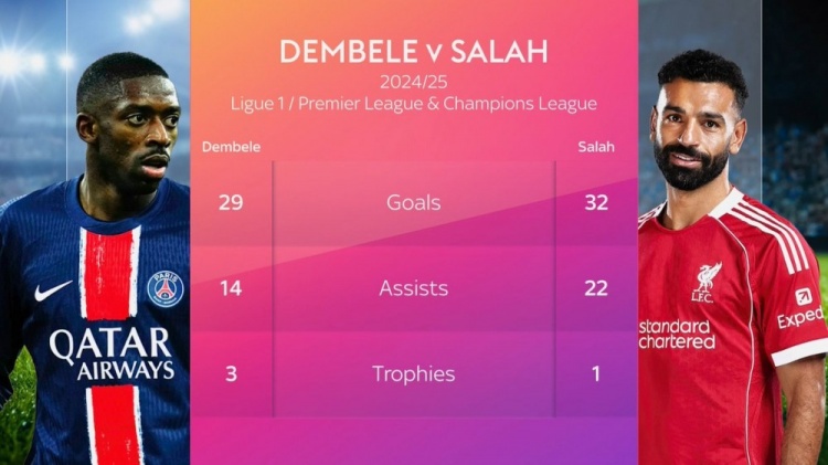 Gần đây, truyền thông "Sky Sports" của Anh đã so sánh dữ liệu của Dembele và Salah trong mùa giải 2024/25 tại League và Champions League.